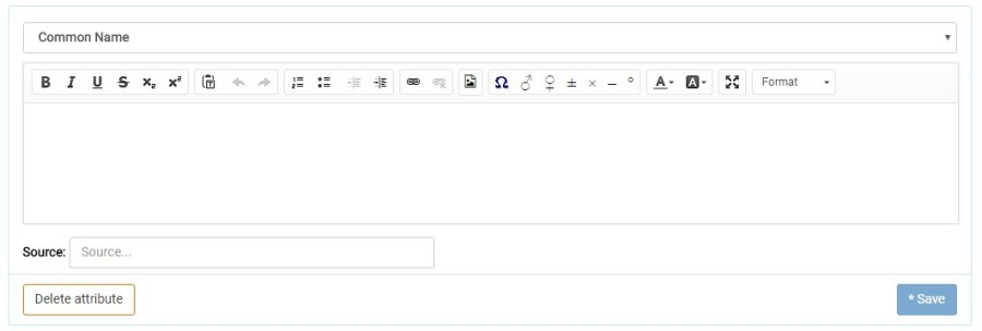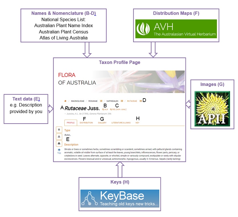 The digital Flora of Australia is managed as a collection of taxon profiles, which can be for any taxonomic rank (Currently only Family, Genus, Species and intra-specific taxa). Each profile contains a textual description (treatment) of that taxon (Figure 2.1E), and automatically linked data. Within profiles, the information in a treatment is broken up into different attributes, or subheadings (e.g. Description, Habitat, and Distribution, Figure 2.1E). For more information on how to fill these see Section 5 and Section 6.