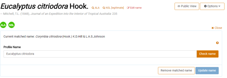 4. In the Profile Name dialogue box, type “Corymbia citriodora”, and click “Check name”. This will match to the name “Corymbia citriodora (Hook.) K.D.Hill & L.A.S.Johnson”.