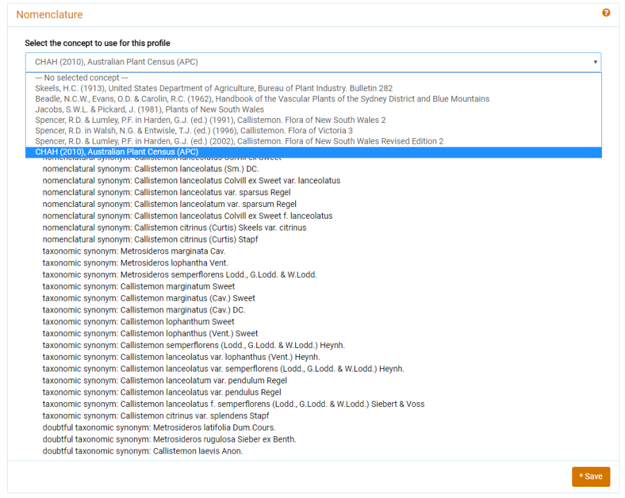 Once the profile has been created, the taxonomic concept as applied on the profile must be set. This is through a link to a specific APNI instance, and will display the appropriate publication and synonymy information in the nomenclature block.