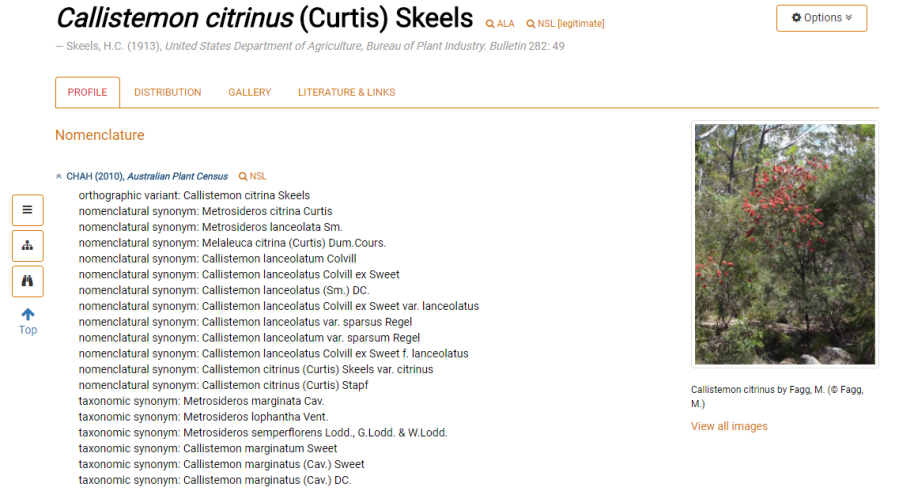 This shows that the FoA legacy profile has matched to its accepted name (Corymbia citriodora) via the synonyms stored in the ALA names cache. This comes across in the names used in the taxonomic hierarchy, the AVH maps, the images and the ALA button next to the profile name.